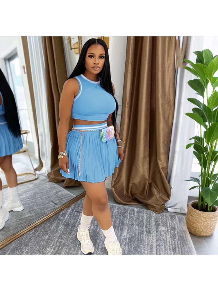Blue Plain Cropped Tank Pleated Skirt Sets